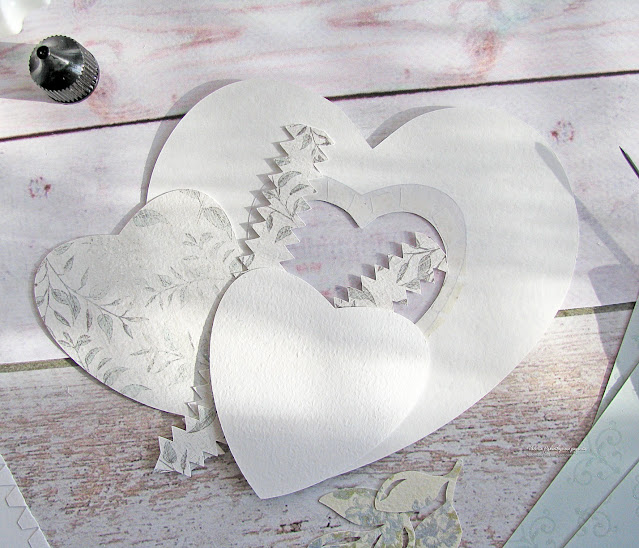 После вырезания из скрапбумаги отверстия для шейкера, мне стало жалко оставлять такой элемент, и я нашла ему применение. Вырезав еще несколько сердец разных размеров, я сделала небольшие открыточки для подписи и пожеланий, добавив пару элементов для вырезания, надпись и пайетку.